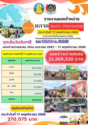 สำนักงานพัฒนาชุมชนจังหวัดอำนาจเจริญ ร่วมกับสภาอุตสาหกรรมท่องเที่ยวจังหวัดอำนาจเจริญ ดำเนินกิจกรรม “ตลาดฮิมอ่าง” อย่างต่อเนื่องทุกวันจันทร์ เพื่อส่งเสริมและยกระดับเศรษฐกิจฐานรากของจังหวัด โดยมีเป้าหมายในการสร้างรายได้ให้แก่ผู้ประกอบการ OTOP กลุ่มวิสาหกิจชุมชน และผู้ผลิตสินค้าท้องถิ่น พร้อมทั้งกระตุ้นการบริโภคและการท่องเที่ยวภายในพื้นที่ให้เติบโตอย่างยั่งยืน