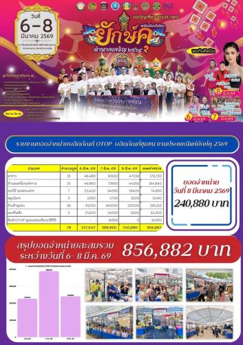 สำหรับผลการจำหน่ายสินค้า วันที่ 8 มีนาคม 2569 มียอดจำหน่ายรวม 240,880 บาท และมียอดจำหน่ายสะสมระหว่างวันที่ 6–8 มีนาคม 2569 รวมทั้งสิ้น 856,880 บาท สะท้อนให้เห็นถึงความสนใจของประชาชนและนักท่องเที่ยวที่เข้าร่วมงาน ตลอดจนศักยภาพของสินค้าชุมชนที่สามารถสร้างมูลค่าเพิ่มและรายได้ให้แก่ประชาชนในพื้นที่ได้อย่างเป็นรูปธรรม